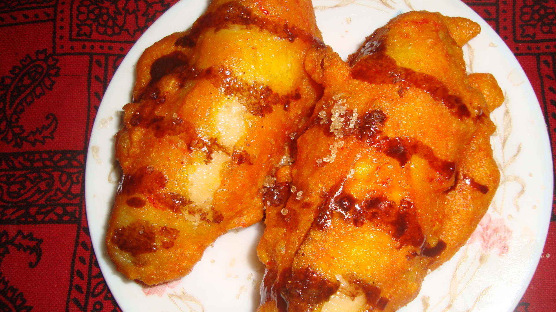5. Deep fry the bananas coated in the batter one by one. Let them cool on a plate on a grease absorbing paper.